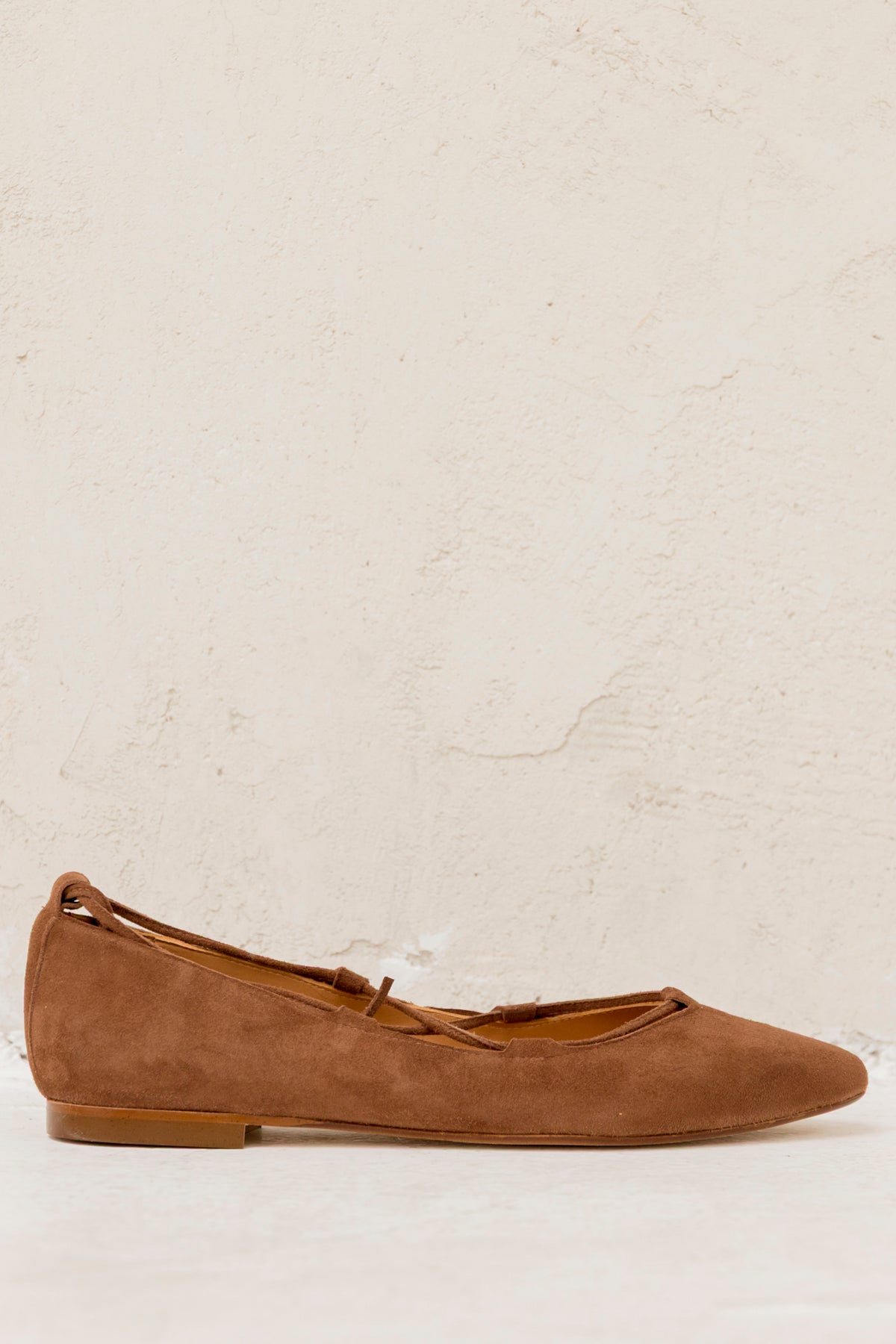 Suede ballerina in red, tied at the ankle with ribbons and 1 cm heel.