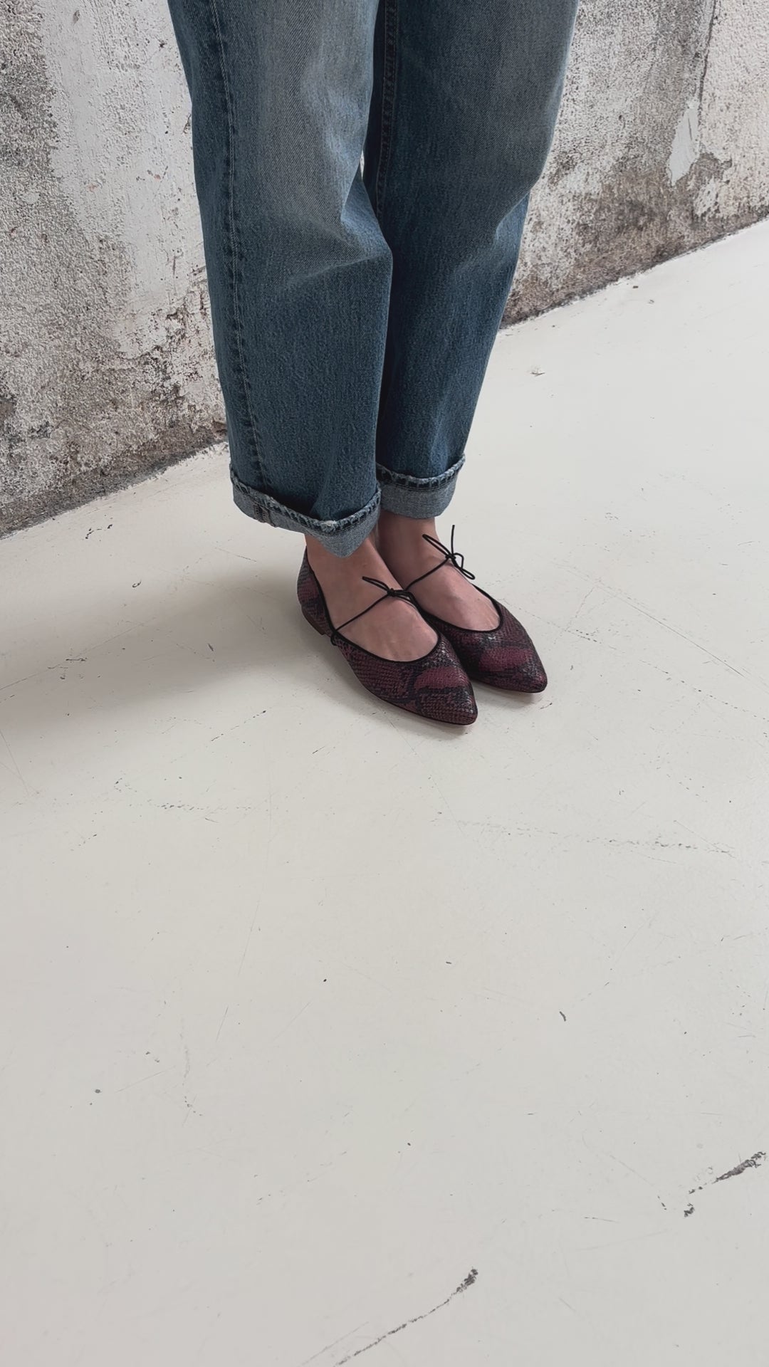 Burgundy embossed leather ballerina flat with a short lace on the instep and a 1 cm heel.