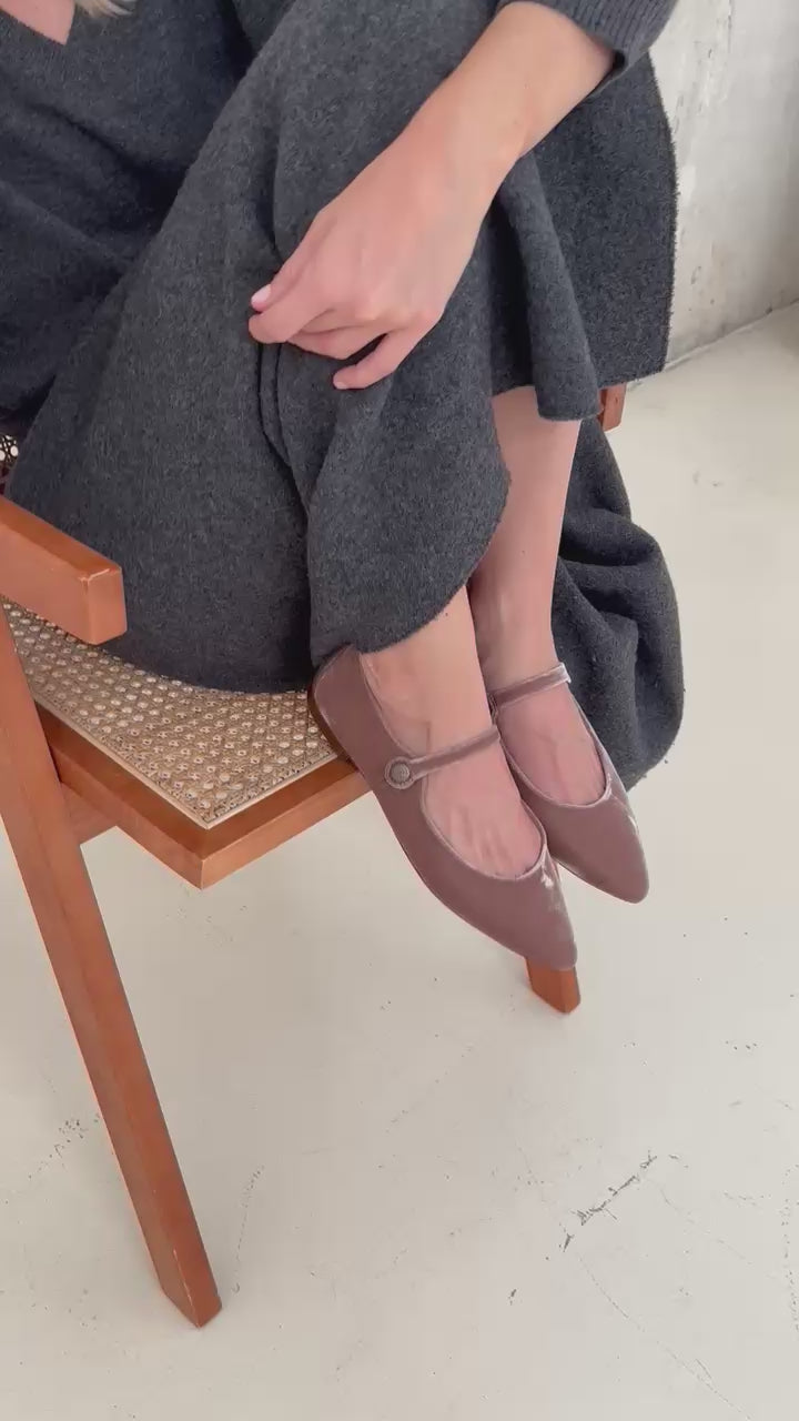 Nude-coloured velvet Mary Jane, click closure and 1 cm heel.