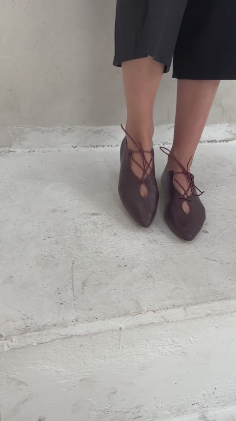 Burgundy leather shoe with matching laces and a 1 cm heel.