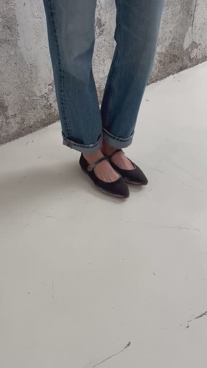 Mercedita de terciopelo en color gris, cierre de clic y tacón de 1 cm.