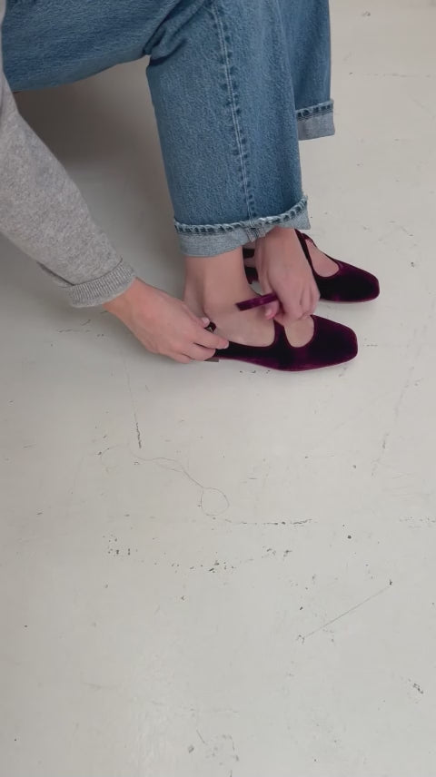 Mercedita de terciopelo en color burdeos, cierre de hebilla y tacón de 1 cm.