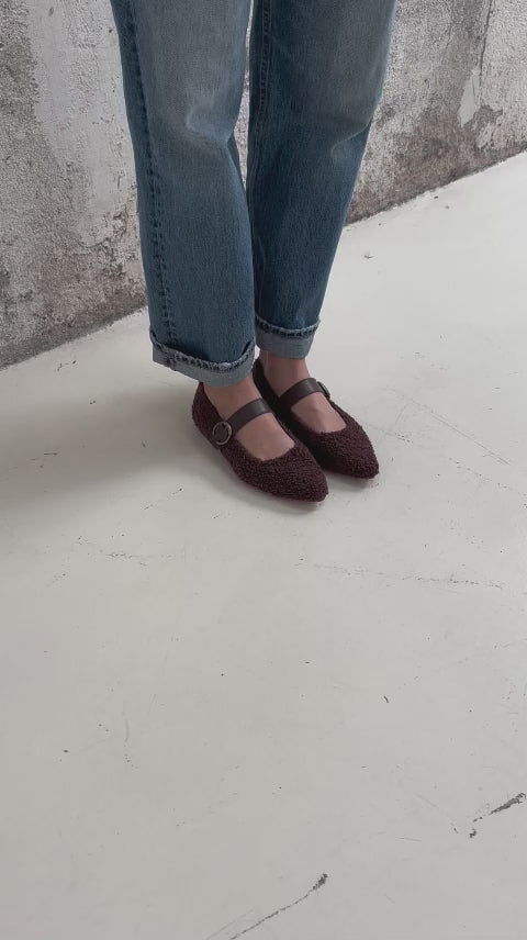 Bailarina de borreguito en color marrón, cierre de hebilla de piel y tacón de 1 cm.