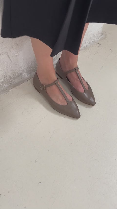 T-Bar de piel en color topo, cierre de hebilla y tacón de 1 cm.