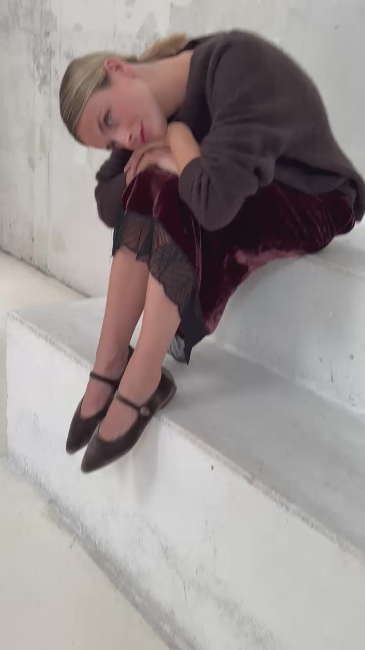 Mercedita de terciopelo en color marrón, cierre de clic y tacón de 1 cm.